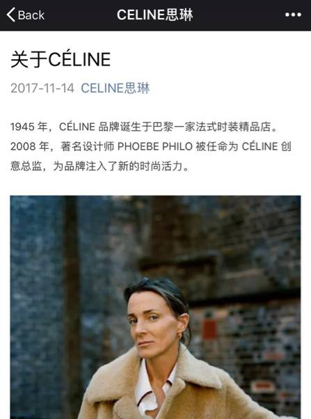 Following Fendi, Buburry, Dolce&Gabbana and Jimmy Choo, luxury brand Céline has now officially joined WeChat. Céline’s first post on WeChat (November 14) has received 7084 views and 78 likes so far.